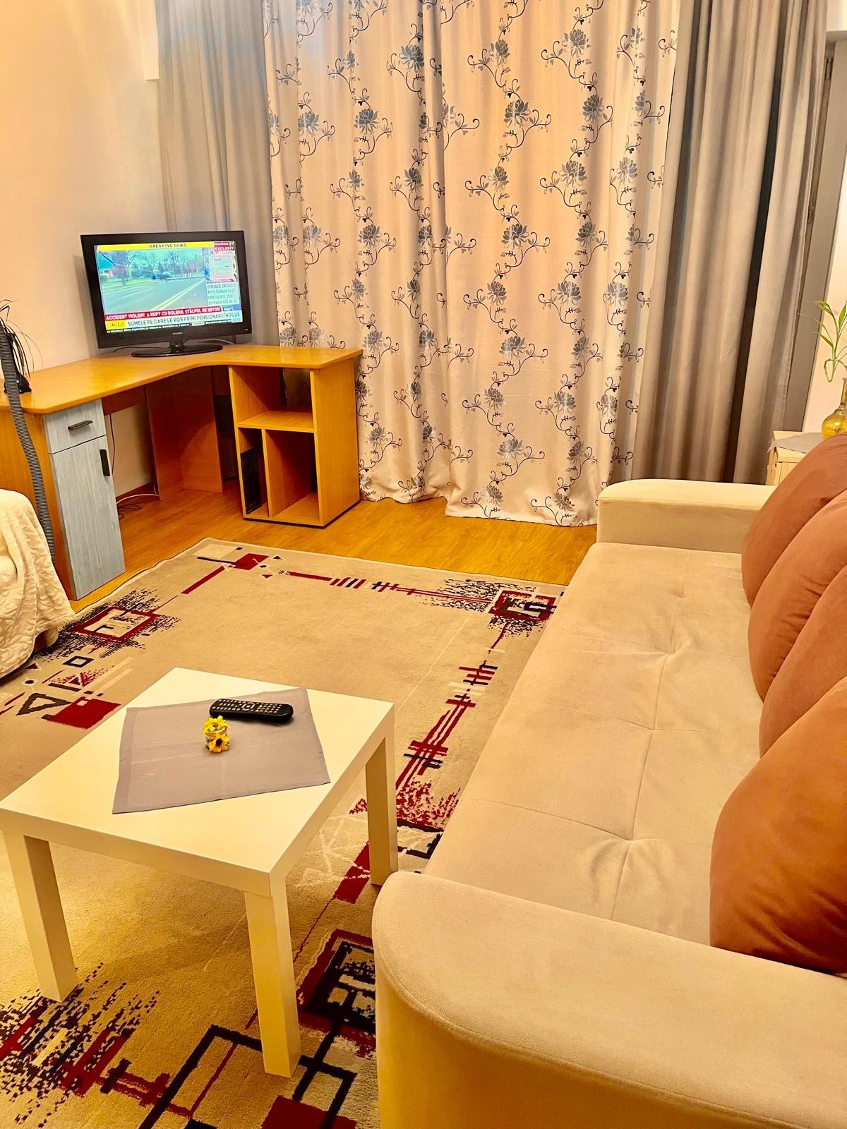 Garsoniera se preda zugravita proaspat si igienizata in conditii de exigenta maxima,cu canapea NOUA si draperie de LUX.Are sensor gaze ,interfon, partile comune sunt supravegheate video si sunt doua lifturi.
