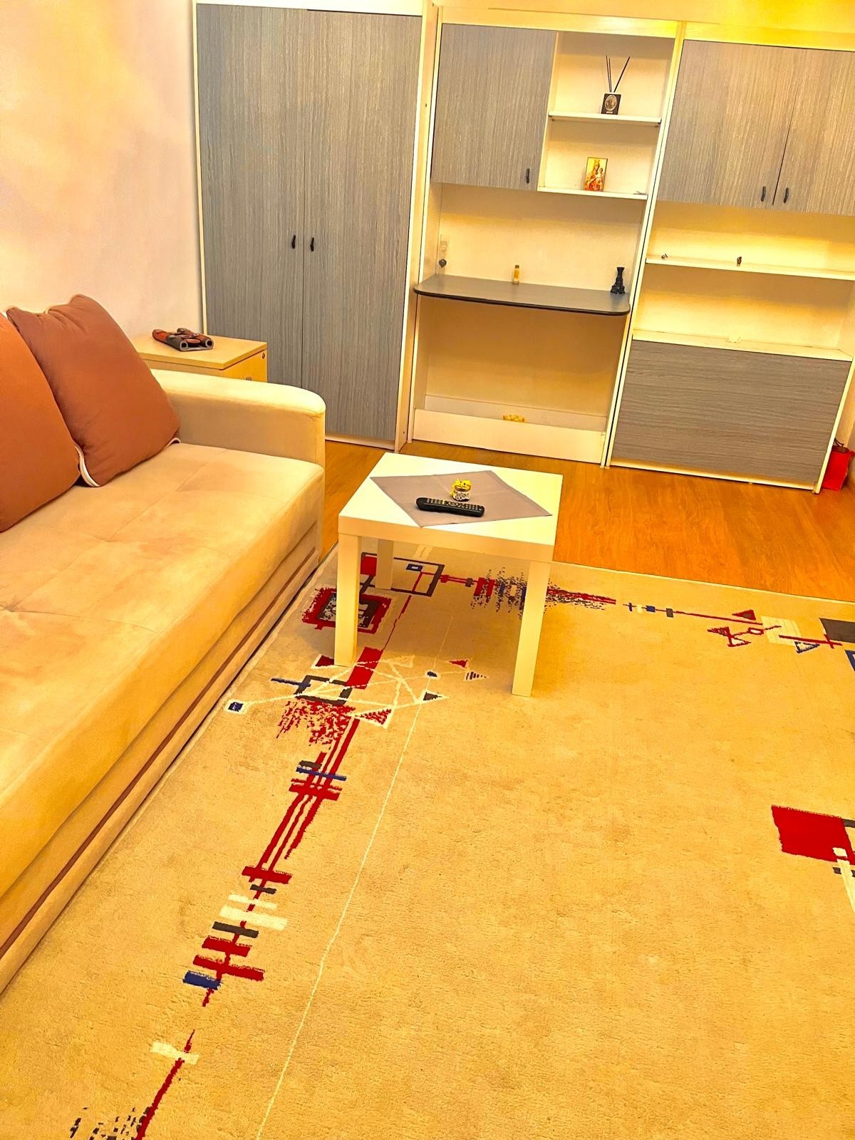 Mobila a fost conceputa in culori gri alb si bej,care ii permit locatarului sa o personalizeze dupa propriile idei si, de asemenea, canapeaua este realizata pe comanda,in functie de spatiul avut,pentru a putea sa se incadreze in perfecta armonie cu interiorul.Totodata garsoniera mai dispune si de o canapea intima ikea.Covorul ,draperiile,perdelele sunt proaspat spalate.