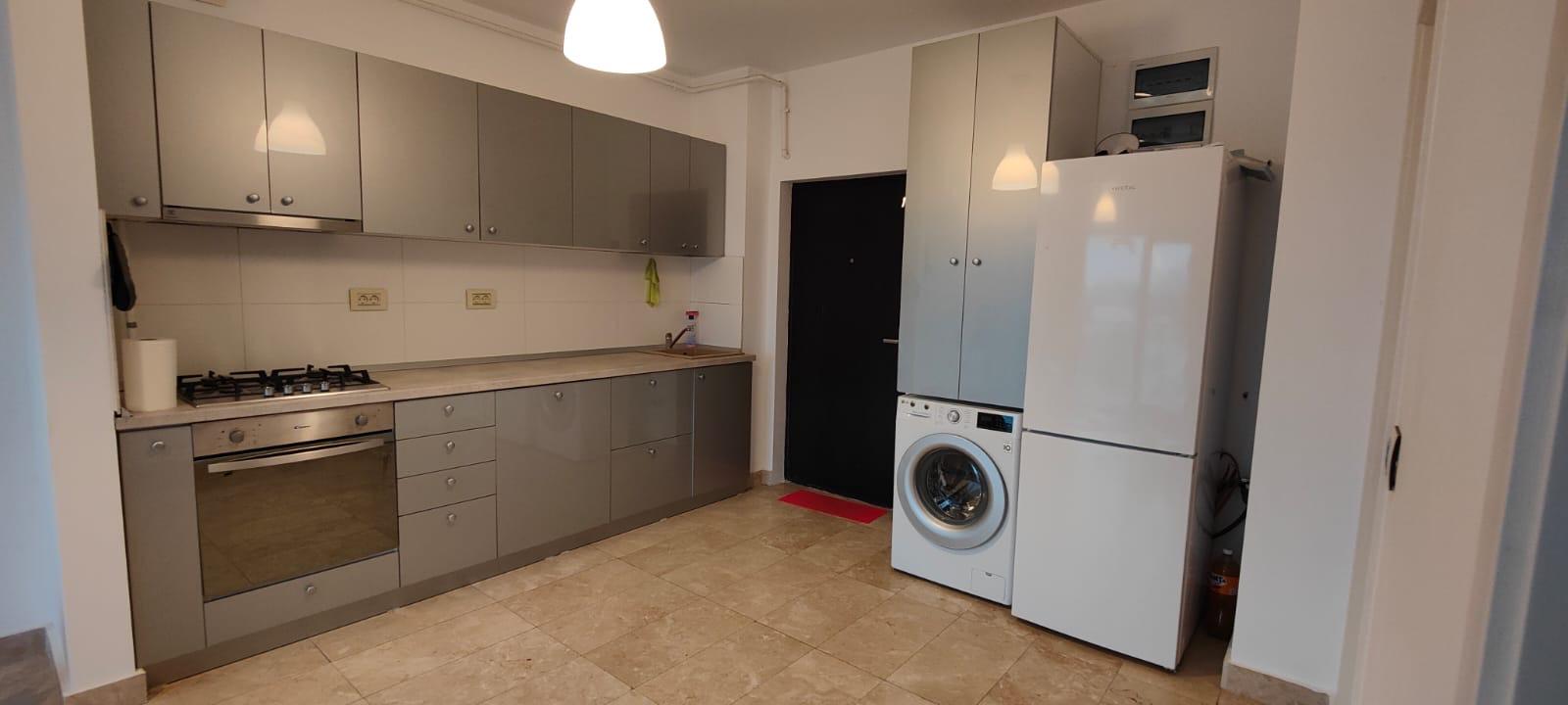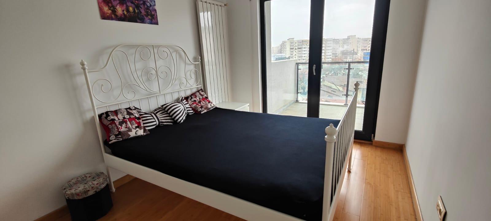 Apartamentul este semi mobilat: bucatarie 100% mobilata si utilata (masina de spalat rufe, vase, frigider, plita, cuptor etc.), dormitor mobilat (pat, masa toaleta, dulap), living room nemobilat, baie mobilata, balcon 10 mp nemobilat.