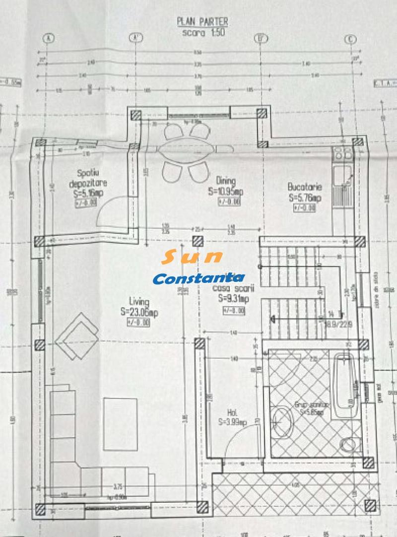 • Parter: living, bucatarie + dining , spatiu de depozitare, hol + casa scarii, baie;