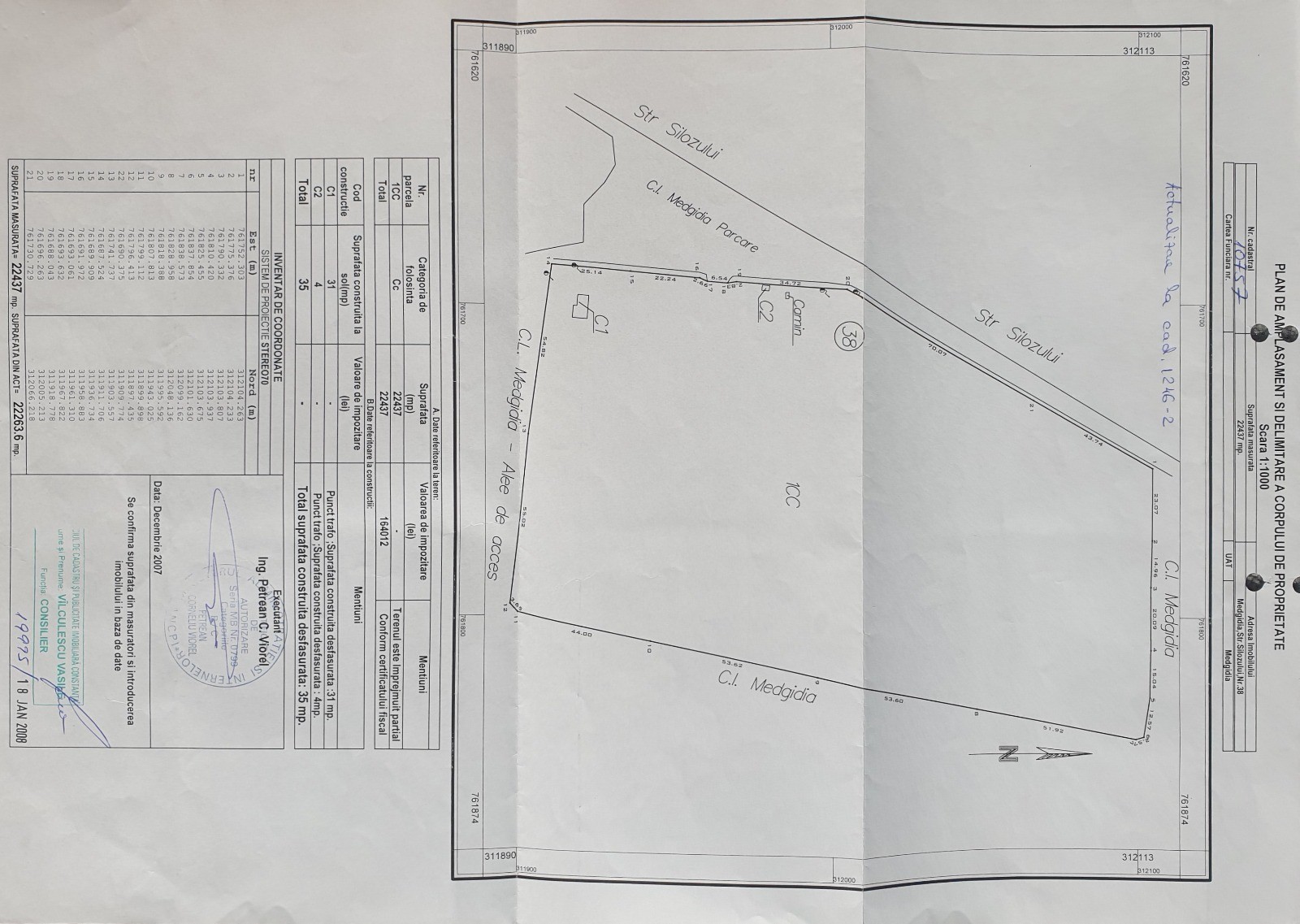 Suprafață: 22.437 mp de teren intravilan pregătit pentru dezvoltare, conform documentației cadastrale oficiale.