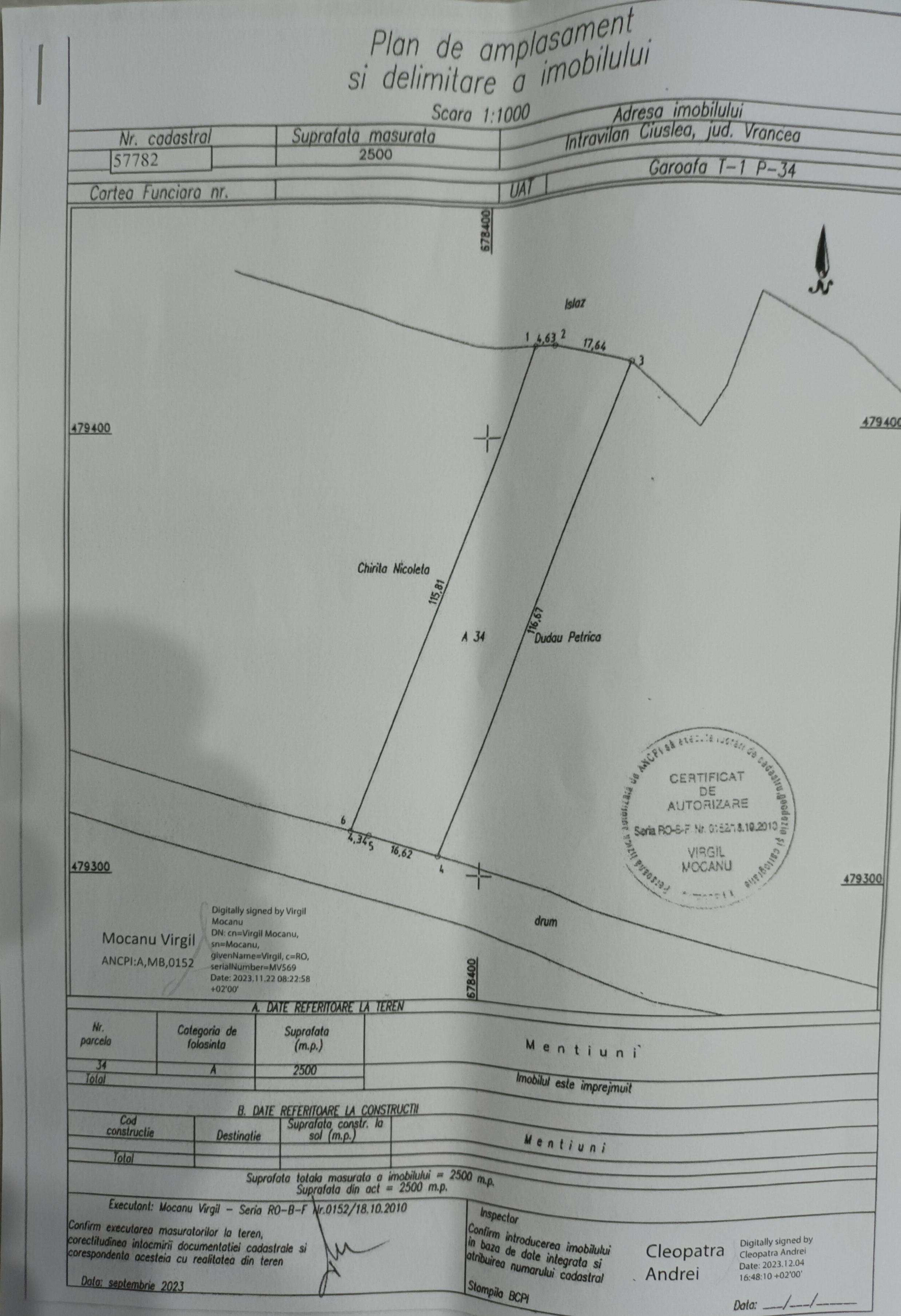 Proprietar, vand teren intravilan, loc de casa in suprafata de 2500 mp, sat Ciuslea- Comuna Garoafa, judet Vrancea
