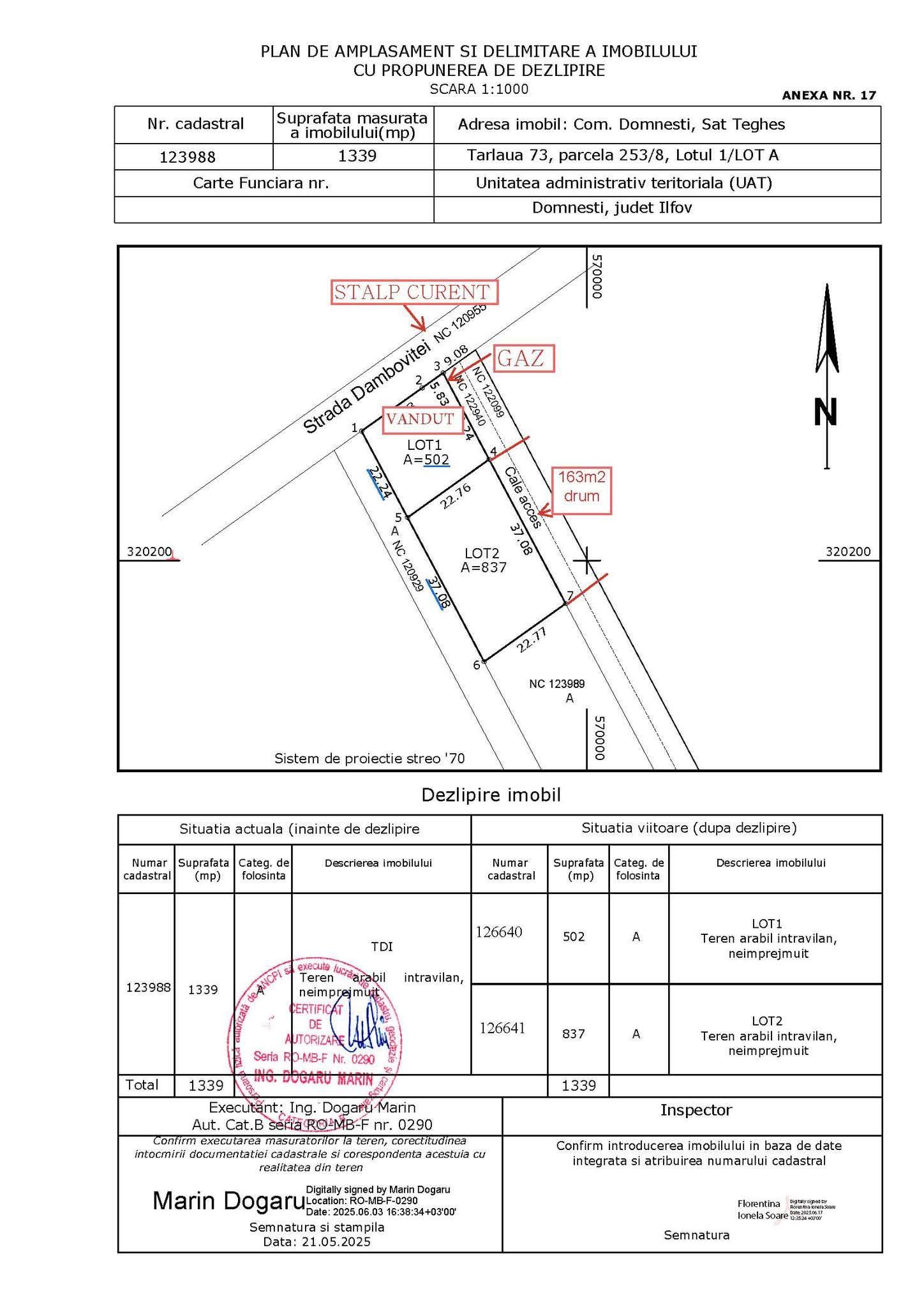 Terenul are 837 mp utili, iar 163 mp reprezinta drumul de servitute, cota parte a terenului.