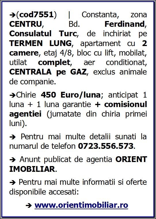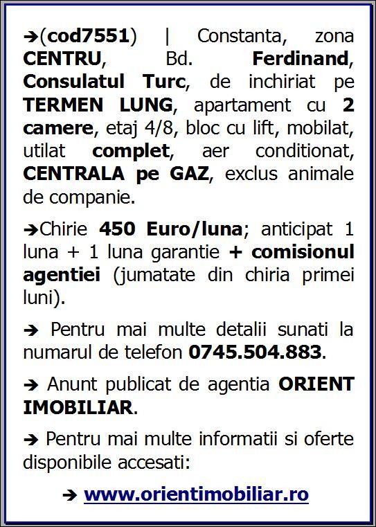 (cod7551) | Constanta, zona CENTRU, Bd. Ferdinand, Consulatul Turc, de inchiriat pe TERMEN LUNG, apartament cu 2 camere, etaj 4/8, bloc cu lift, mobilat, utilat complet, aer conditionat, CENTRALA pe GAZ, exclus animale de companie.