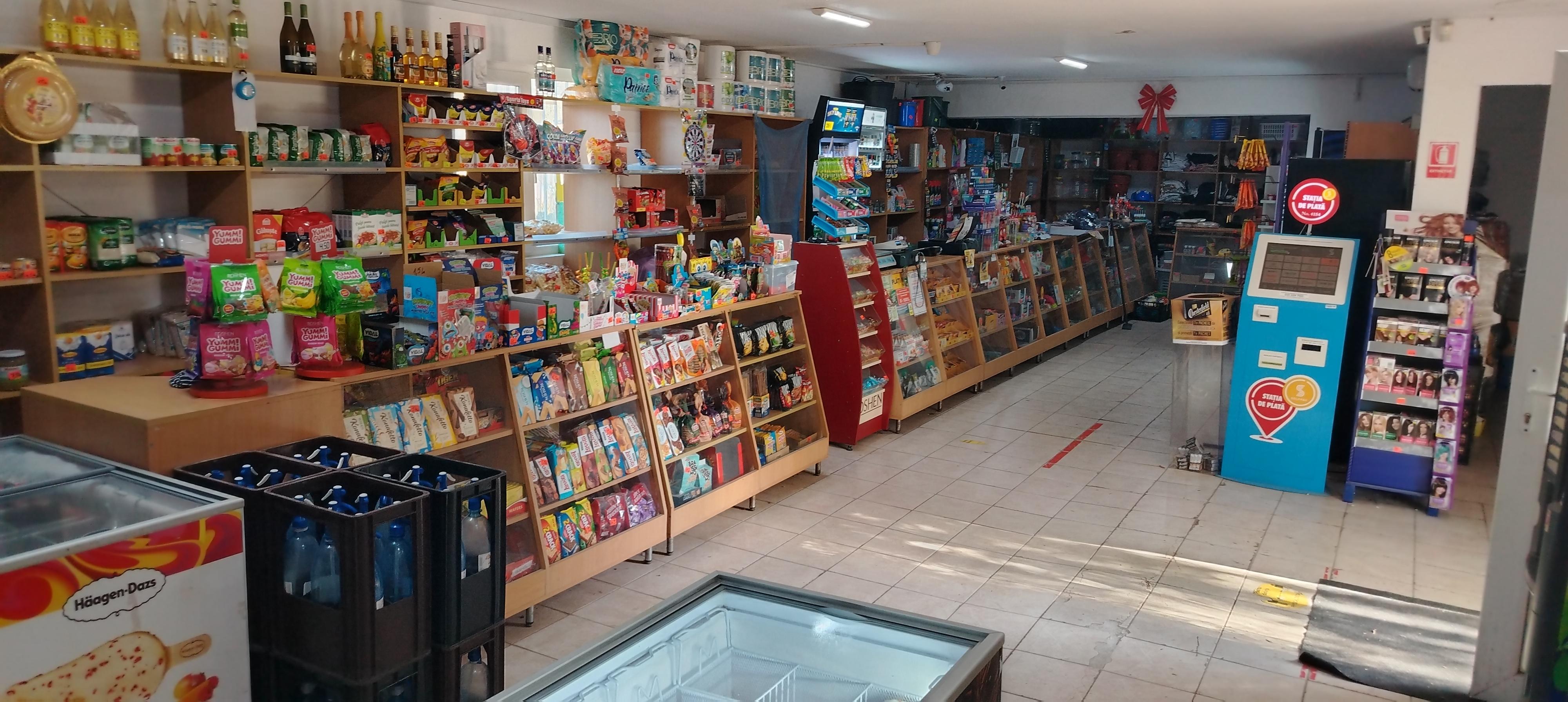 Spațiul comercial cu rafturi, vitrina pe perete are și un teren de 2000 de mp (25 x 80)