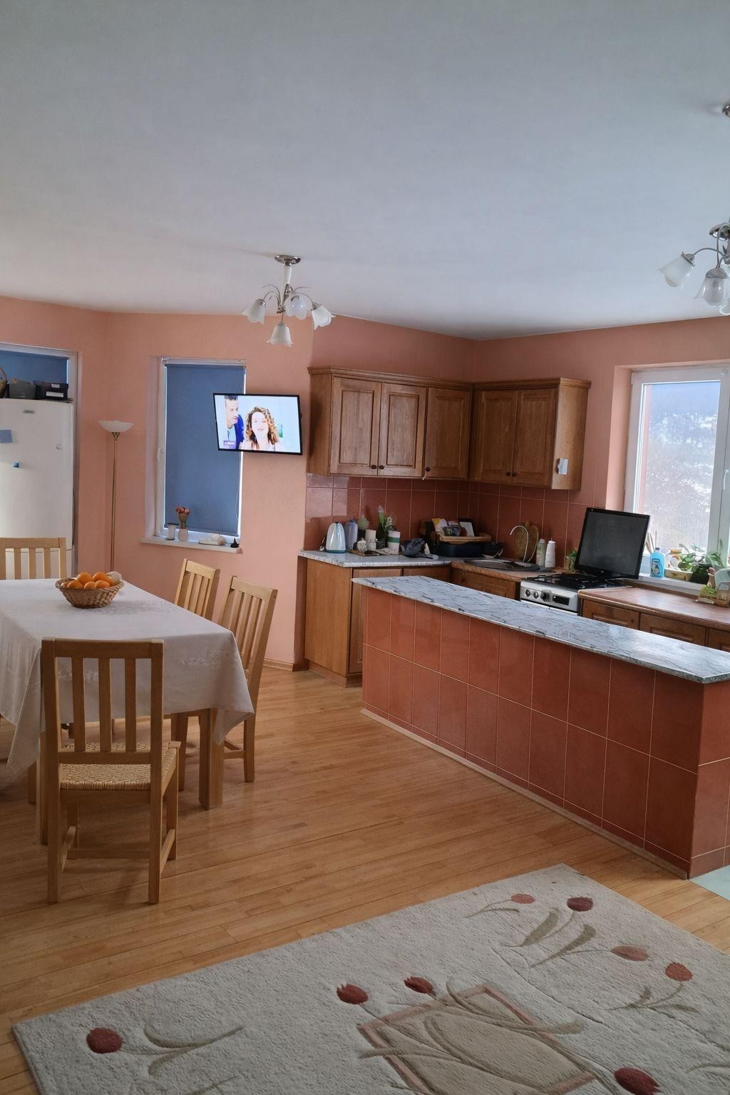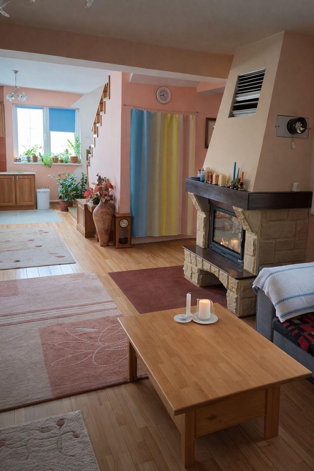 La subsol beci si camera tehnica cu centrala pe lemne 35 kw Candle si centrala electrica trifazica Protherm 35 kw cu 3 trepte de putere,la parter terasa mare ,sufragerie,dormitor,bucatarie,baie,camara,la etaj 3 dormitoare cu 2 bai,terase la toate dormitoarele,